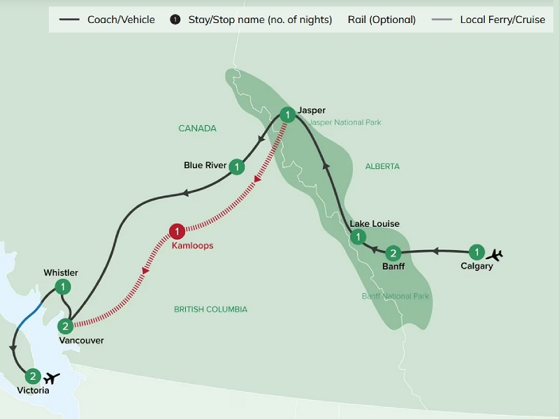 Or alternatively, choose to travel to Vancouver via the luxurious Rocky Mountaineer Rail across two days. You’ll travel through the stunning landscapes and overnighting in Kamloops before reaching Vancouver late in the evening and rejoining the group. Ask our Travel Specialists on this option. Please note if choosing Rocky Mountaineer this part is not escorted.