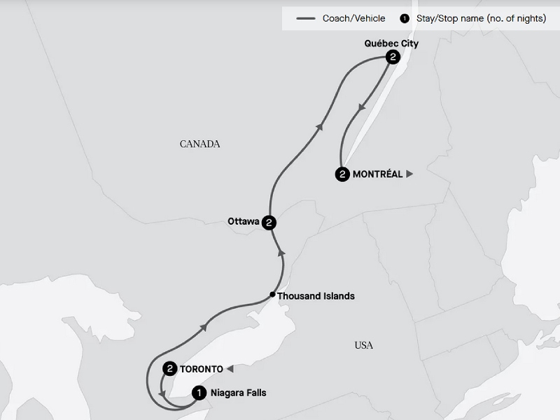 9 night tour begins Toronto ends Montreal: Fly into Toronto 2 nights - Niagara Falls 1 night - Ottawa 2 nights - Quebec City 2 nights - Montreal 2 nights - Fly home