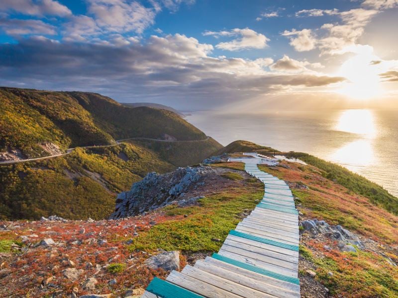 “No visit to Nova Scotia is complete without a trip to Cape Breton, an island of soaring cliffs, Gaelic heritage, and world-class scenery. The Cabot Trail, which loops around the island’s northern coast, offers some of the most spectacular drives in North America. The road winds through Cape Breton Highlands National Park, where mountains plunge dramatically into the sea. Stop at lookouts, hike a forest trail, or sample fresh lobster in a seaside village.